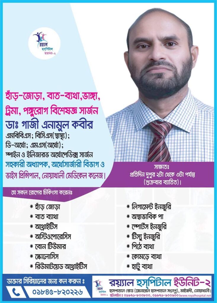 এমবিবিএস; বিসিএস (স্বাস্থ্য); ডি-অর্থো; এমএস (অর্থো); স্পাইন ও ইলিজারভ অর্থোপেডিক্স সার্জন সহকারী অধ্যাপক, অর্থোসার্জারী বিভাগ ও ভাইস প্রিন্সিপাল, নোয়াখালী মেডিকেল কলেজ।