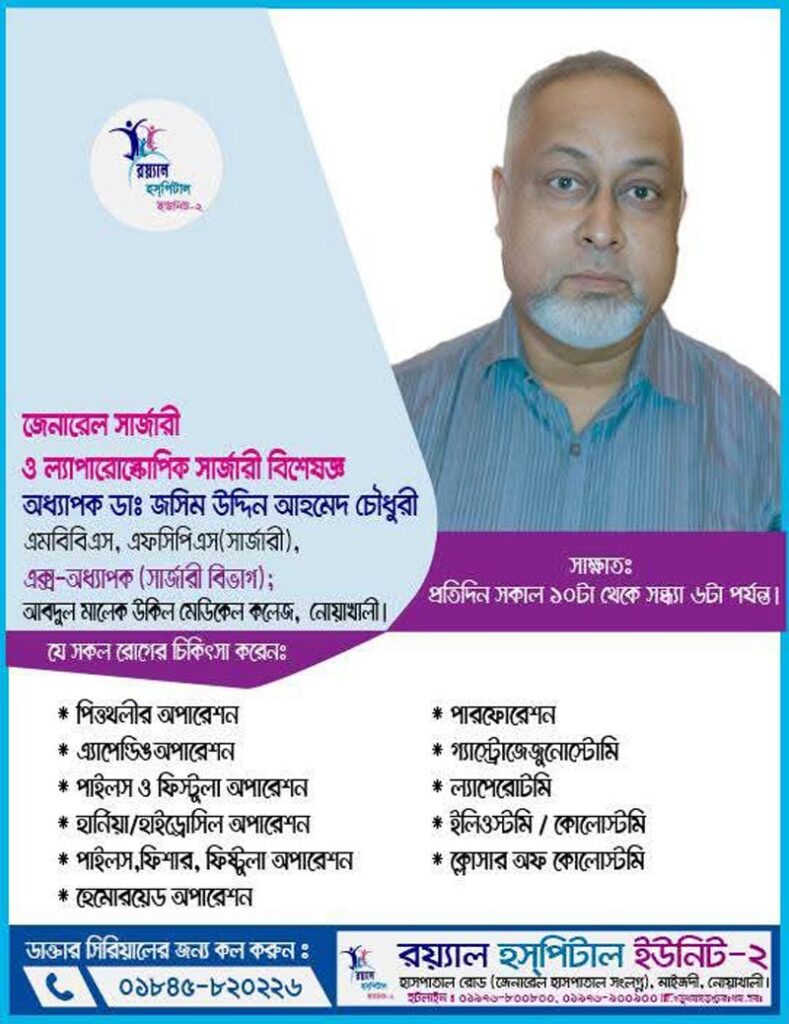 সার্জারি বিশেষজ্ঞ ও এন্ডোল্যাপারোস্কোপিক সার্জন হেপাটোবিলিয়ারি, কলোরেকটাল, জেনারেল ও ইউরোলজিক্যাল সার্জারি