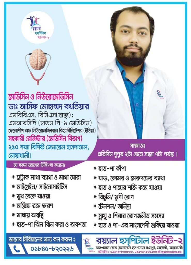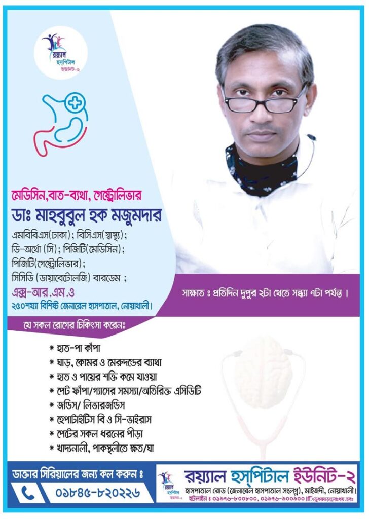 মেডিসিন, বাতজ্বর, বাত-ব্যথা, হাইপ্রেসার, বক্ষব্যাধি, ডায়াবেটিস ও হৃদরোগ বিশেষজ্ঞ
